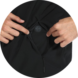 - Die Batterietasche ist strategisch in der Mitte des Rückens platziert, um offensichtliche Bewegungen der Batterie zu vermeiden. Außerdem verfügt die Batterietasche über einen halbautomatischen YKK-Reißverschluss mit Sturmschutzklappe für ein sauberes Erscheinungsbild.