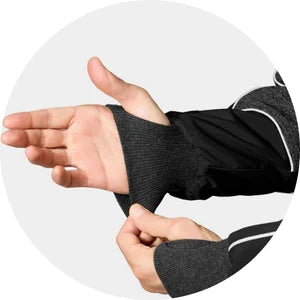 - Daumenlochbündchen helfen, die Elemente abzuhalten und ermöglichen Ihnen, Ihre Beweglichkeit während der Arbeit zu erhalten.